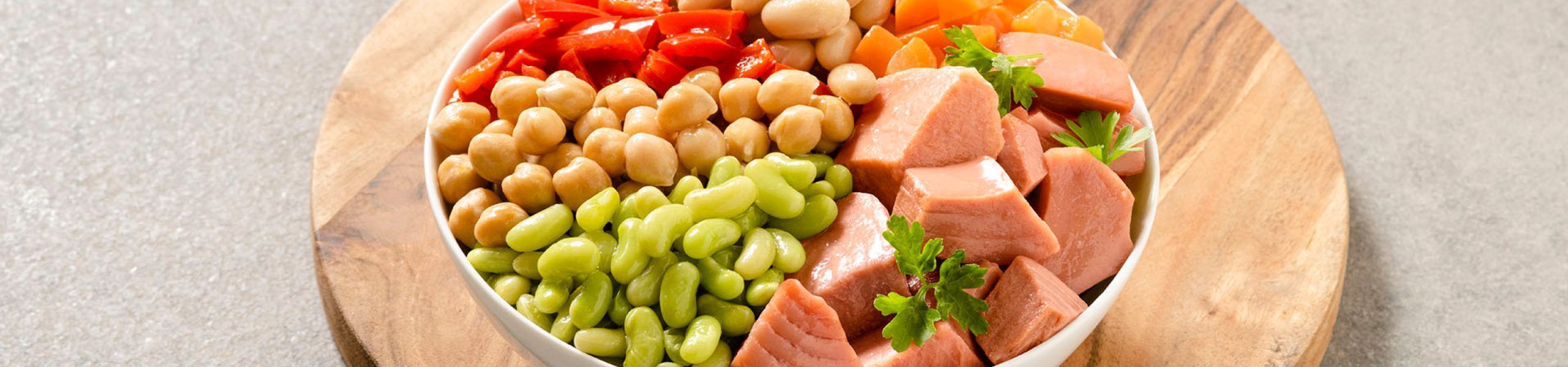 Zutaten: Gemüse zu variablen Anteilen 42,9 % (Weiße Bohnen, junge grüne Bohnen, Karotten, Kichererbsen, rote Paprika, schwarze Oliven), Thunfisch (Katsuwonus pelamis) 30 %, Sauce 27,1 % (Wasser, Sonnenblumenöl, Tomatenmark, jodiertes Salz, Gewürze, Kartoffelstärke).